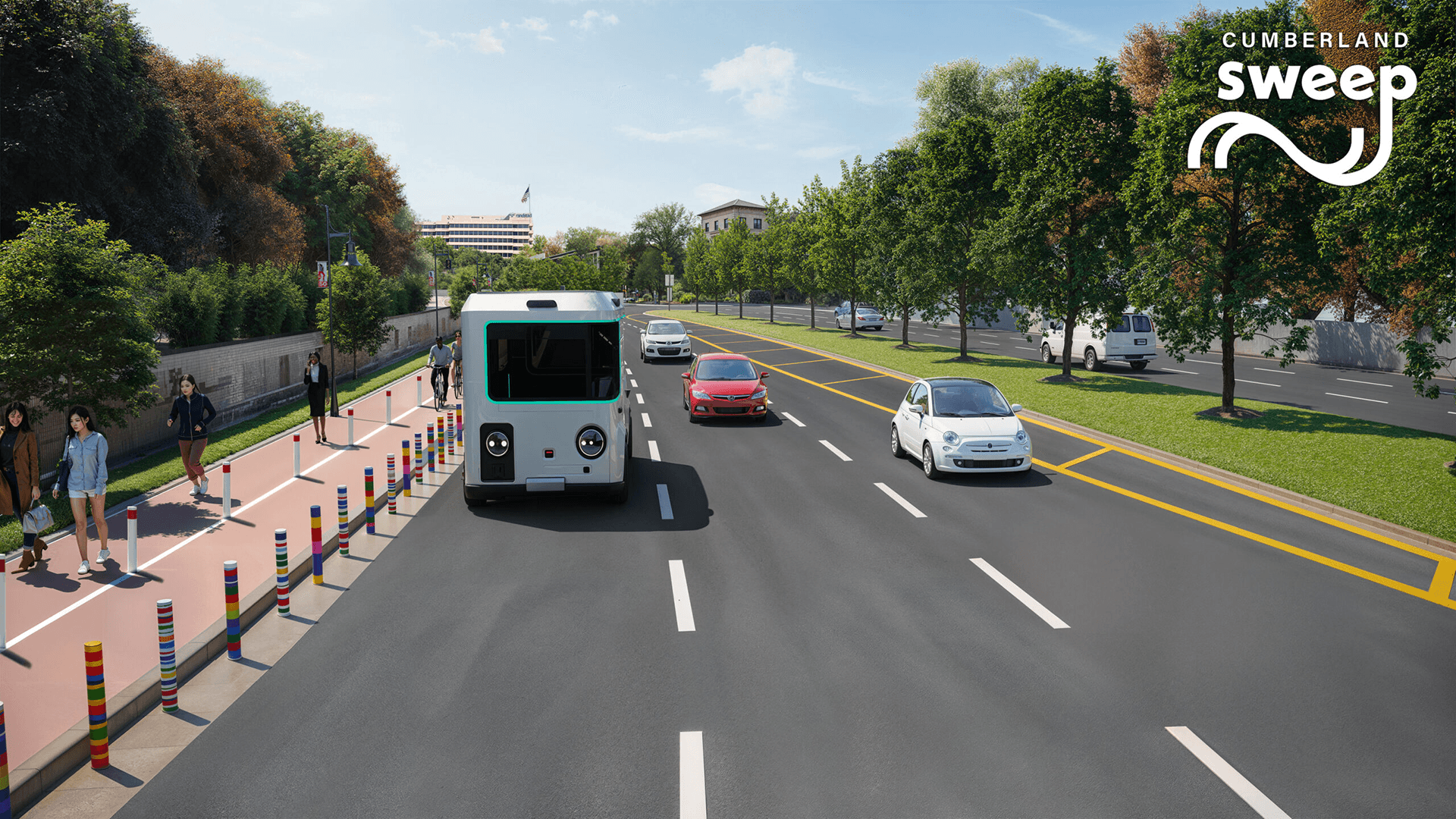 Introducing the Cumberland Sweep, a three-mile multimodal path designed to improve connectivity throughout the core of Cumberland with dedicated walking and biking lanes and an autonomous shuttle network (Cumberland Autonomous Mobility Network) that will make travel easier, more reliable, and safer.